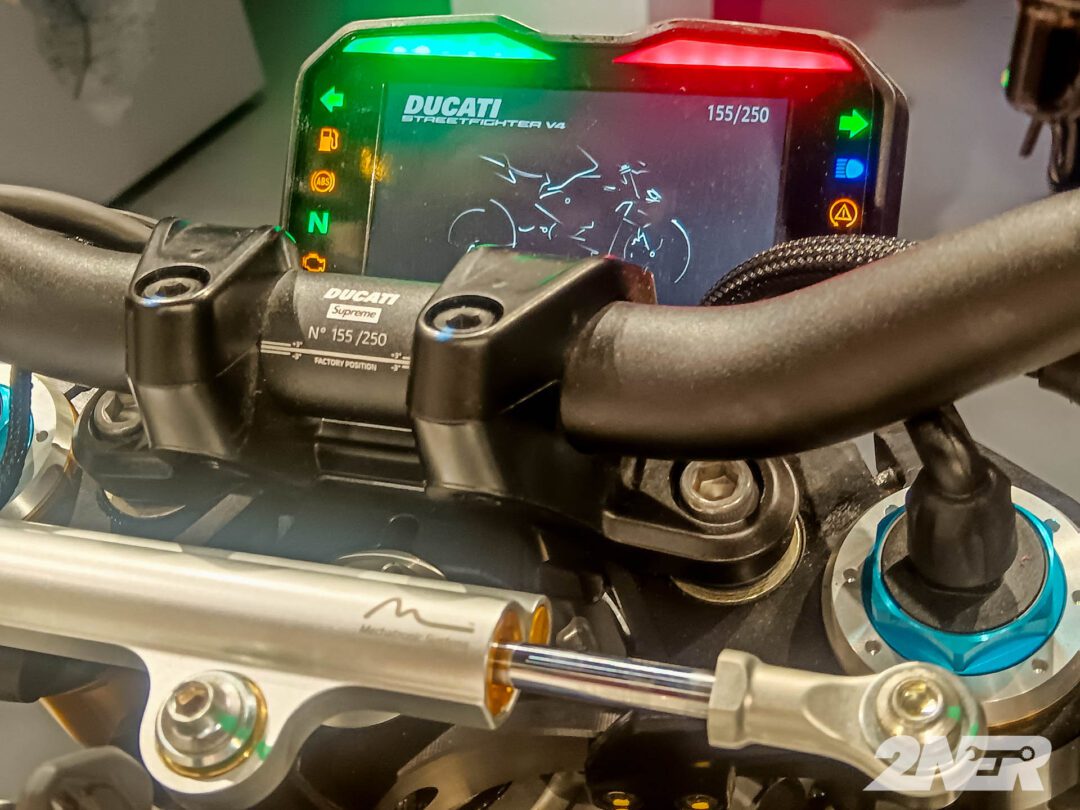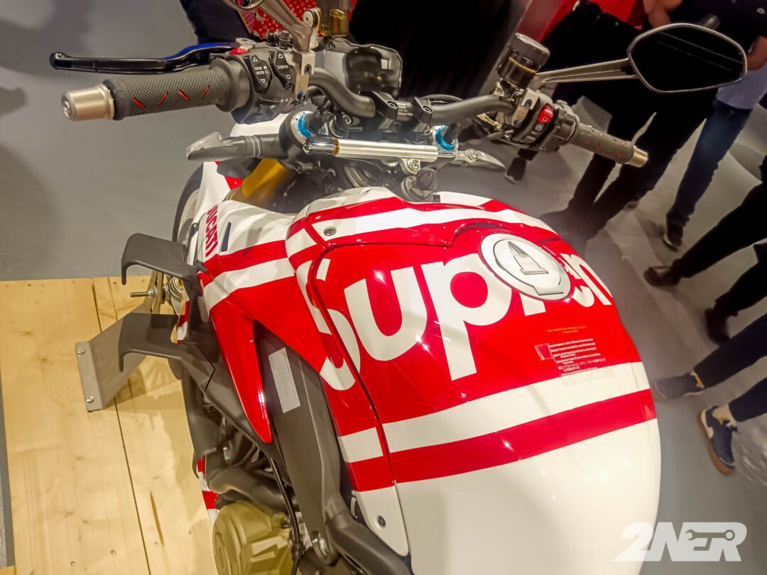 Its striking red and white livery, featuring Supreme’s signature logo, was designed by renowned designer Aldo Drudi, offering an aggressive and dynamic look that perfectly blends Ducati’s racing heritage with Supreme’s bold, urban aesthetic. The bike also comes equipped with Ducati’s top-tier electronics, including ride-by-wire throttle, cornering ABS, traction control, and quick-shift functionality, ensuring a refined, high-performance riding experience.