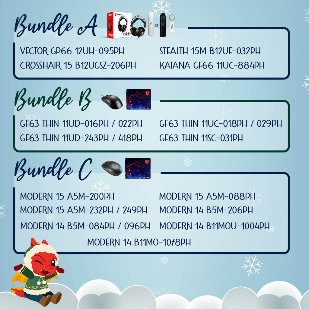 May your presents be many, and your troubles be few as for every purchase of the participating laptops, you can get exclusive freebies from various gaming bundles including an MSI H991 Gaming Headset, MSI gaming mouse, MSI Thermos Bottle, and many more!