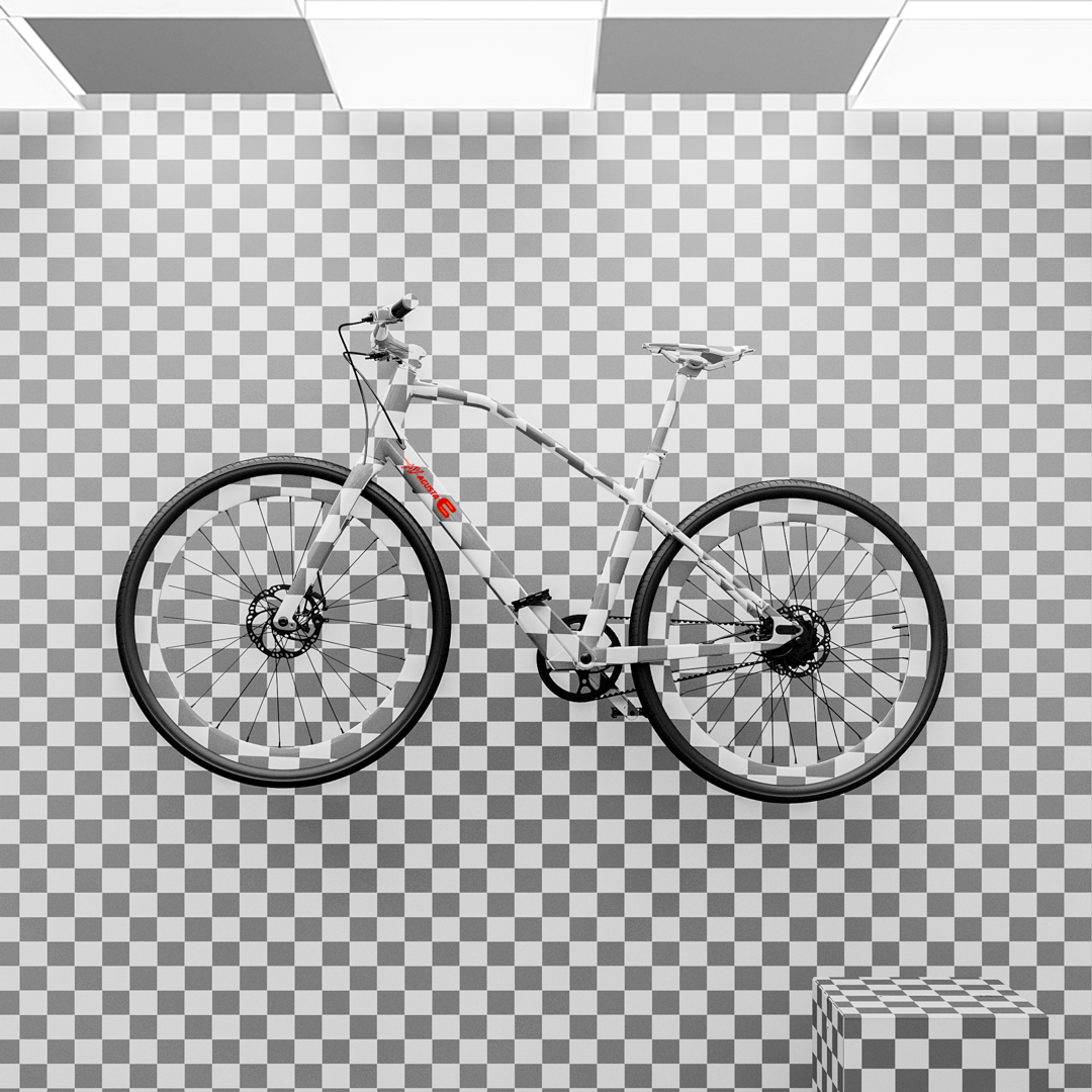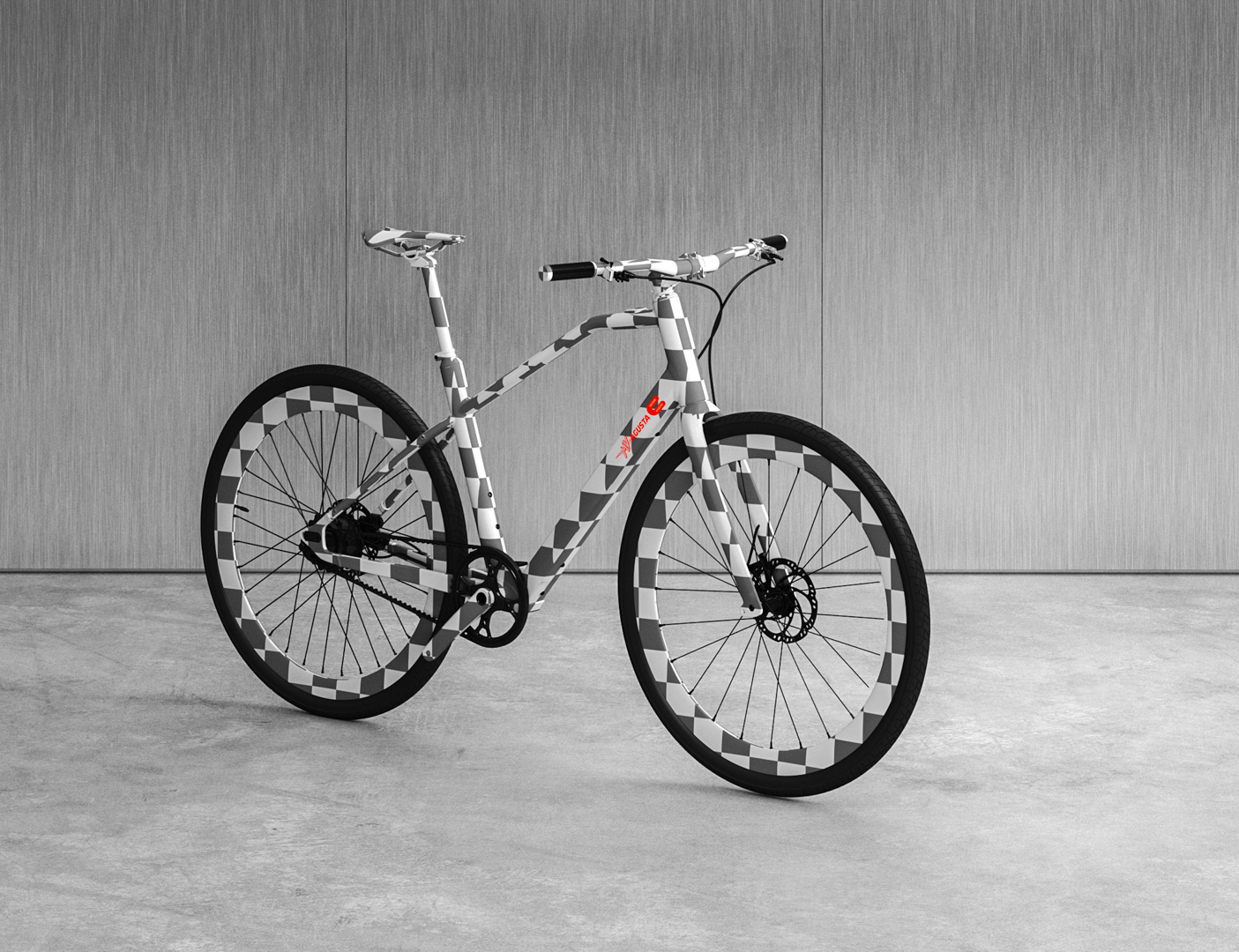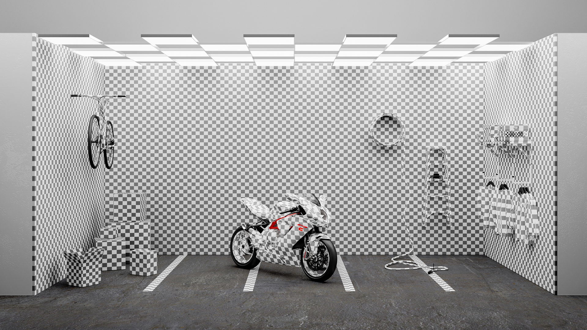 With The Garage, Nuriev continues his investigation into overlooked, transitory spaces, which the designer considers to be metaphors for “traveling through different layers of space, reality, and consciousness”—a theme explored in much of his work, which often blend material, virtual and augmented realities. For ComplexCon, Nuriev worked with MV Agusta to map his signature gray-and-white checkerboard pattern onto a custom MV Agusta F3 motorcycle and MV Agusta AMO RC electric bicycle, in addition to a ladder, gasoline tank, shelves, and various storage pieces. The collaborative, limited edition merchandise will be available for purchase on an inquiry basis.
