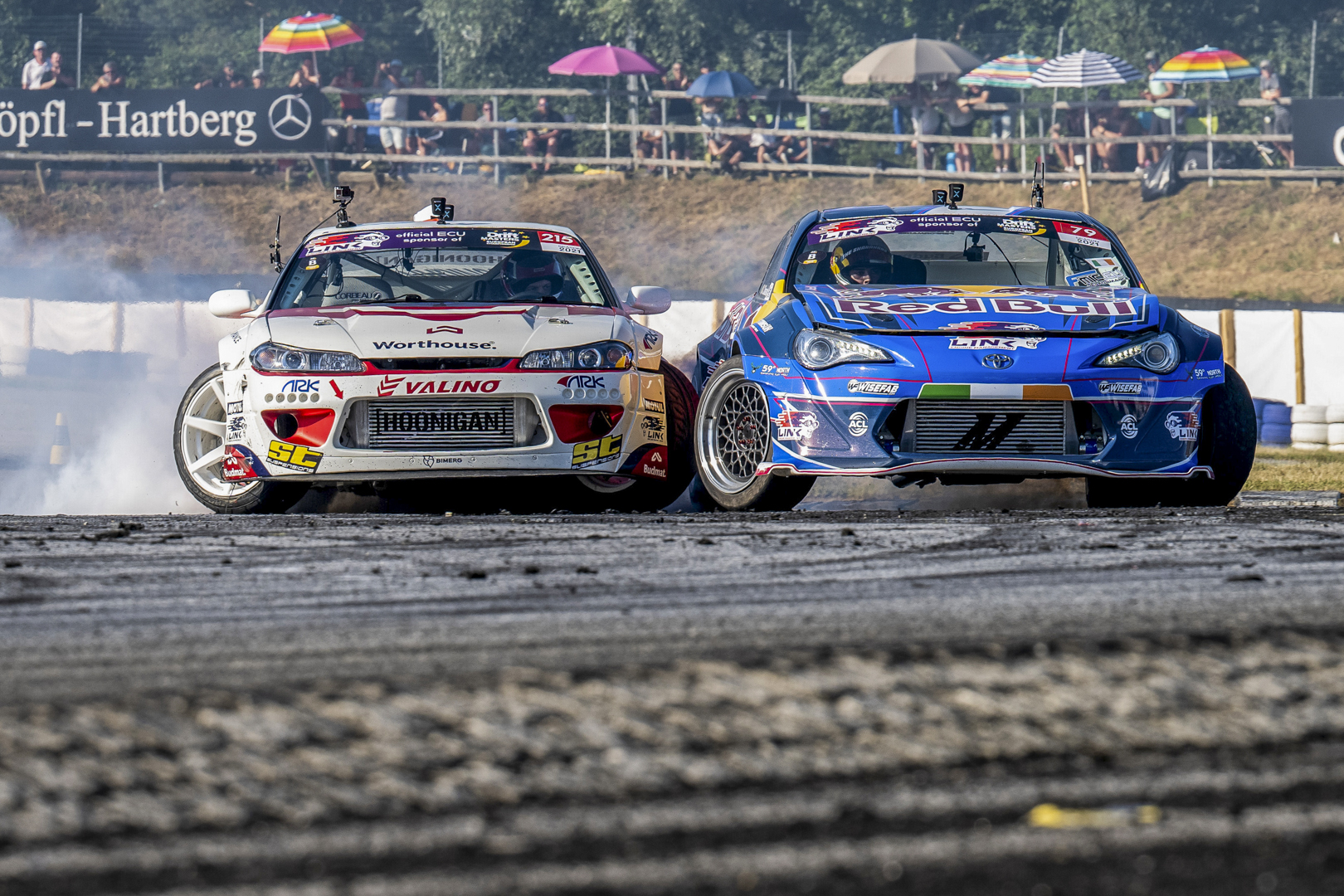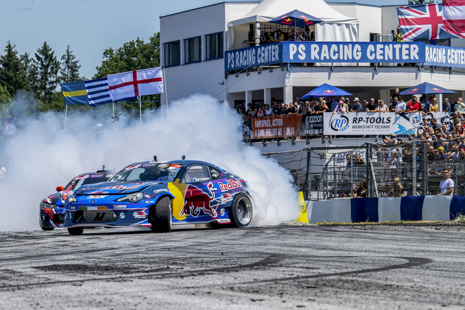 Round one of the Drift Masters European Championship saw 46 drivers enter, with only the top 32 progressing through to the main race. Among those to advance were Shanahan and Joe Hountondji (Germany), one half of the Red Bull Drift Brothers.