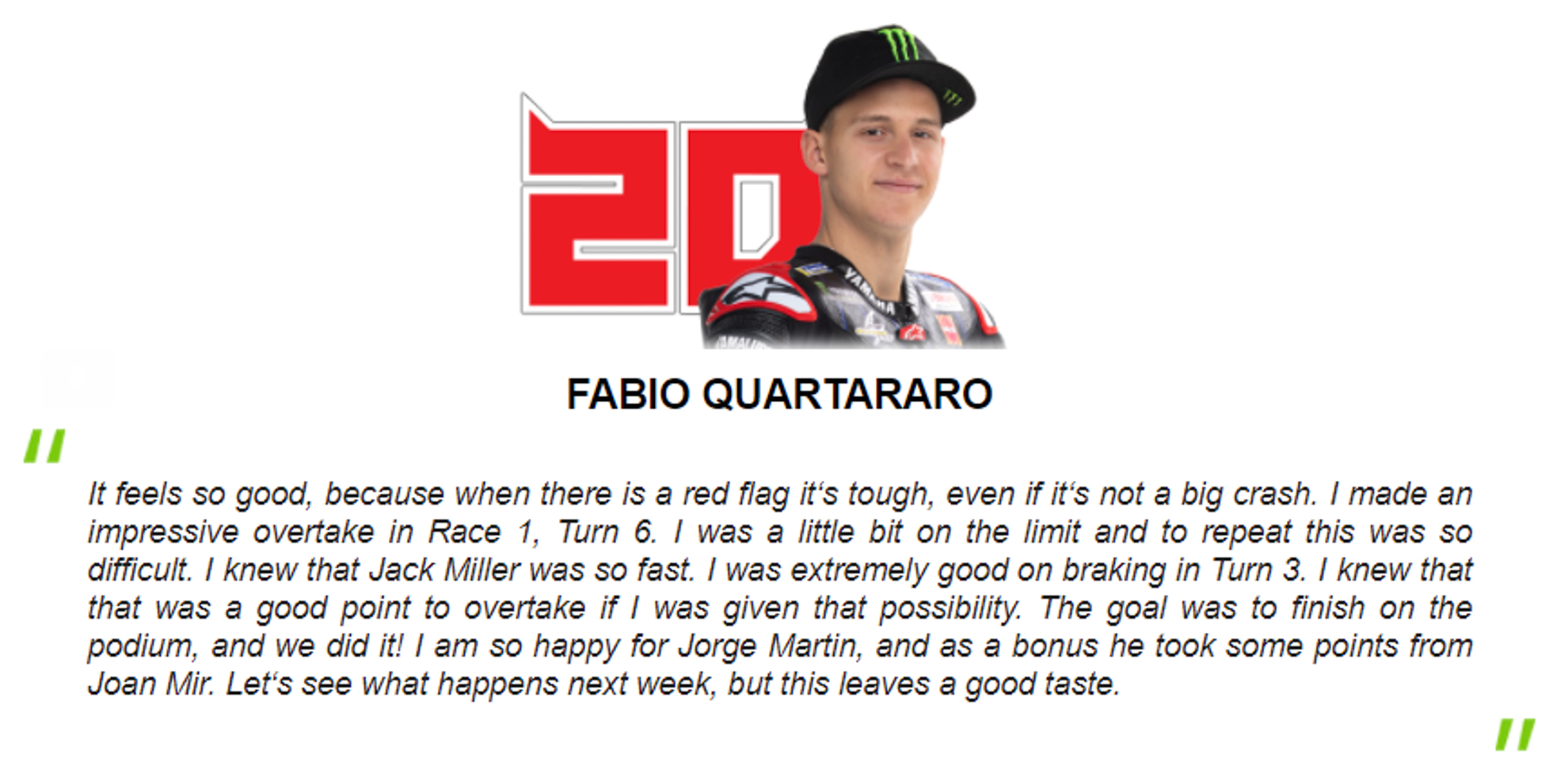 With a 1.479s gap ahead of him, El Diablo put his head down, but he wasn‘t able to close in on the front runners. The Yamaha man then got under pressure from Jack Miller but with 10 laps to go the Australian crashed out whilst trying to stick to the number-20 M1. The remainder of the race was a lonely ride for Quartararo, but he was delighted to finish it in third place, 9.632s from first.