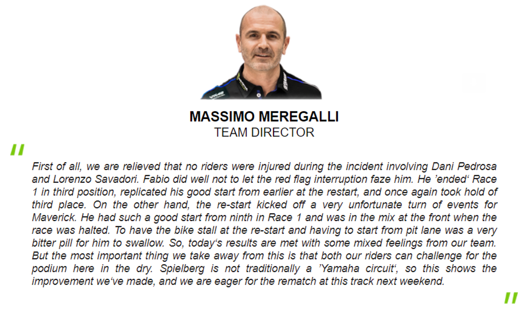 Monster Energy Yamaha MotoGP‘s Fabio Quartararo put in a strong performance at the Spielberg Circuit and pushed to the limit to equal his best previous result in Austria. The stellar third place tastes even sweeter as he extends his championship lead to 40 points. On the other hand, it was a disappointing Sunday for Maverick Viñales, especially after his brilliant start to the initial race before the red flag situation. Having to commence the re-start from pit lane ended any chances he had to finish at the top.