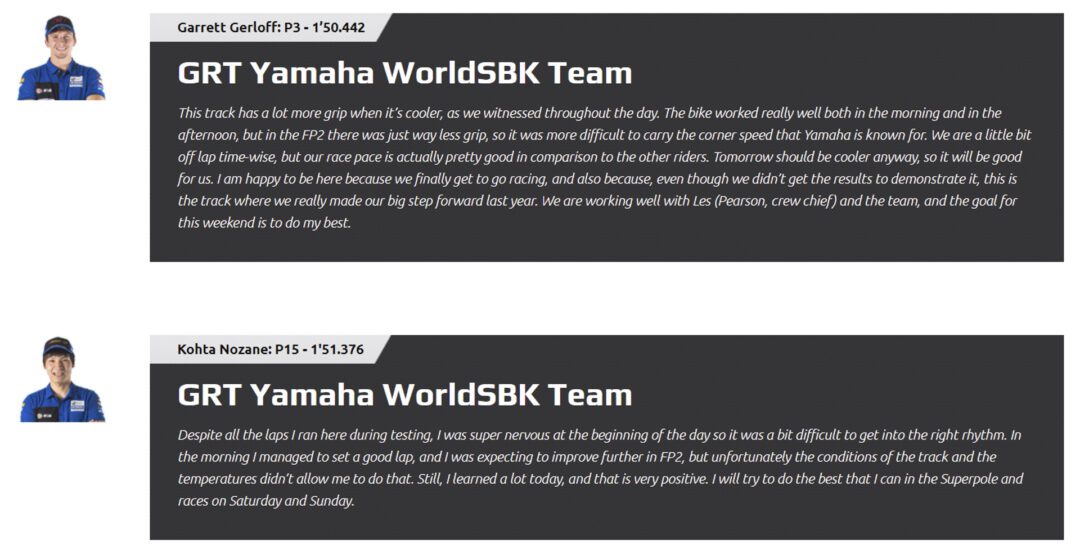 In the cold first free practice session, things looked to be heading in the right direction, with both riders feeling competitive and satisfied with their bikes’ setup. As the temperature rose in the afternoon though, both Garrett Gerloff and Kohta Nozane were unable to extract the one-lap speed seen in the morning, whereas the long-run pace remained strong. The GRT Yamaha team remains confident, as the temperature is forecasted to be lower on Saturday.