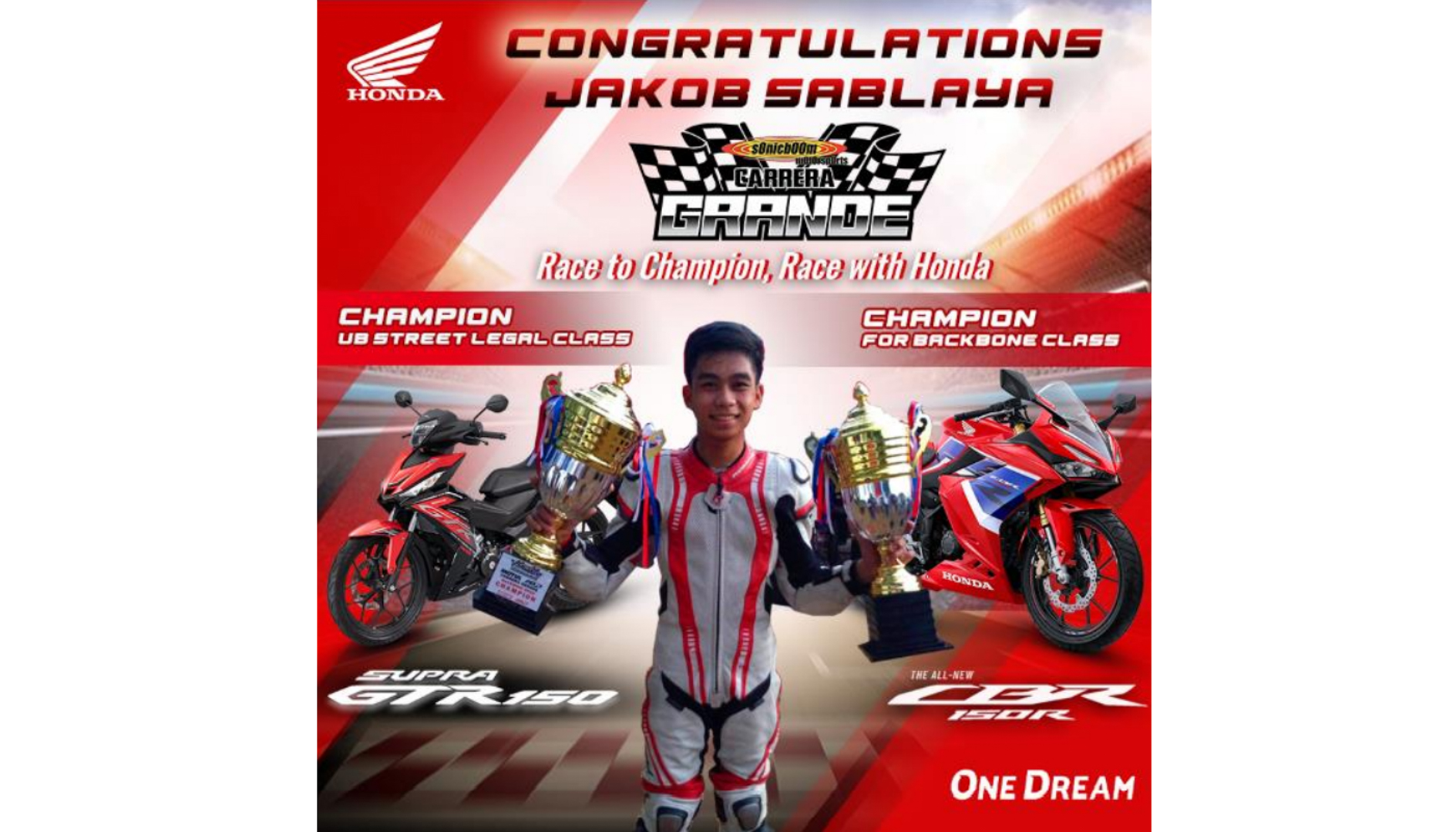 Sponsored by Honda Philippines, Inc., (HPI), the No.1 motorcycle manufacturer in the country, Sablaya competed against 13 racers in the Backbone category while using The All-New CBR150R. He also utilized Supra GTR150 and took on 14 participants in the 150 Underbone Street Legal class.
