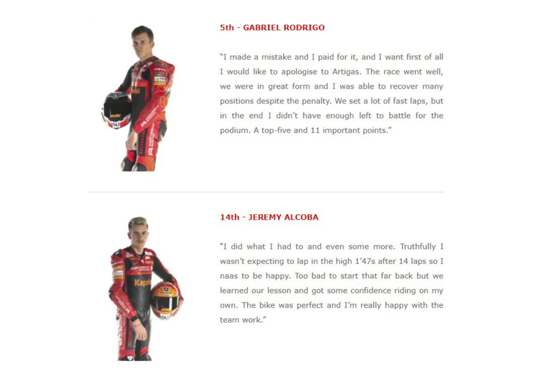 Top-five result for a Gabriel Rodrigo in excellent form, although he received a penalty after a collision with Artigas and had to do a long lap penalty. The Argentinean rider did an incredible job to get back to sixth place but at the finish line he was only 0.060s shy of a podium finish despite setting a new lap record of the track thrice (the fastest one being 1’47.610).