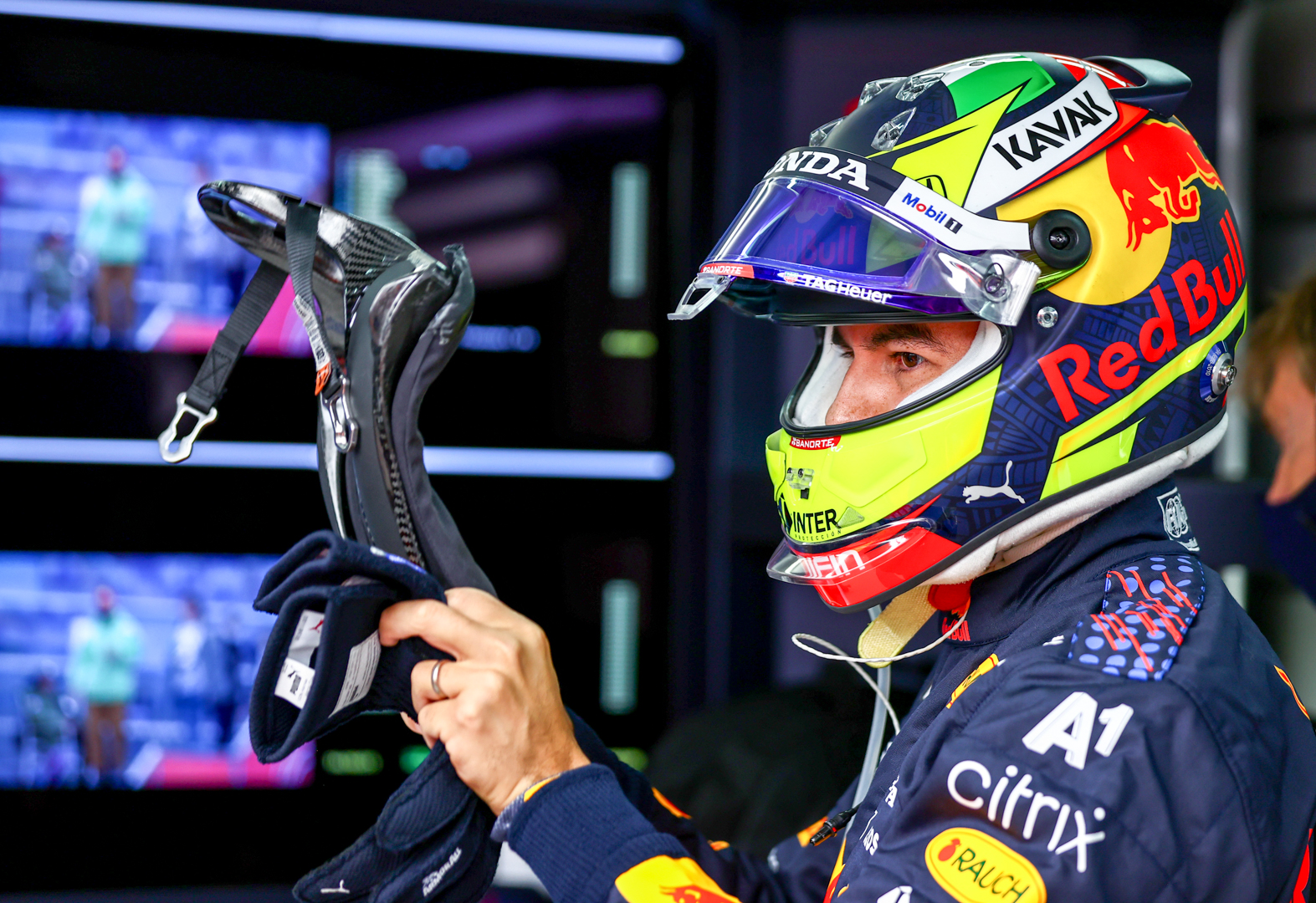 Sergio Perez of Mexico and Red Bull Racing prepares to drive in the garage before the F1 Grand Prix of Russia at Sochi Autodrom on September 26, 2021 in Sochi, Russia. (Photo by Mark Thompson/Getty Images)