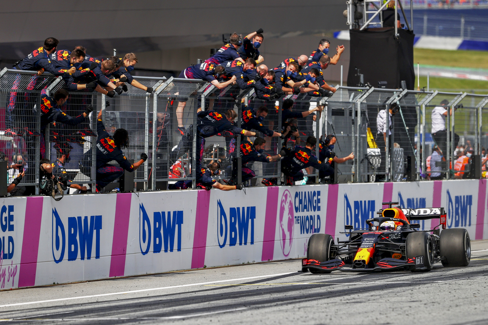 SPIELBERG, AUSTRIA – JULY 04: Race winner Max Verstappen of the Netherlands driving the (33) Red Bull Racing RB16B Honda passes his team celebrating on the pitwall during the F1 Grand Prix of Austria at Red Bull Ring on July 04, 2021 in Spielberg, Austria. (Photo by Clive Rose/Getty Images)