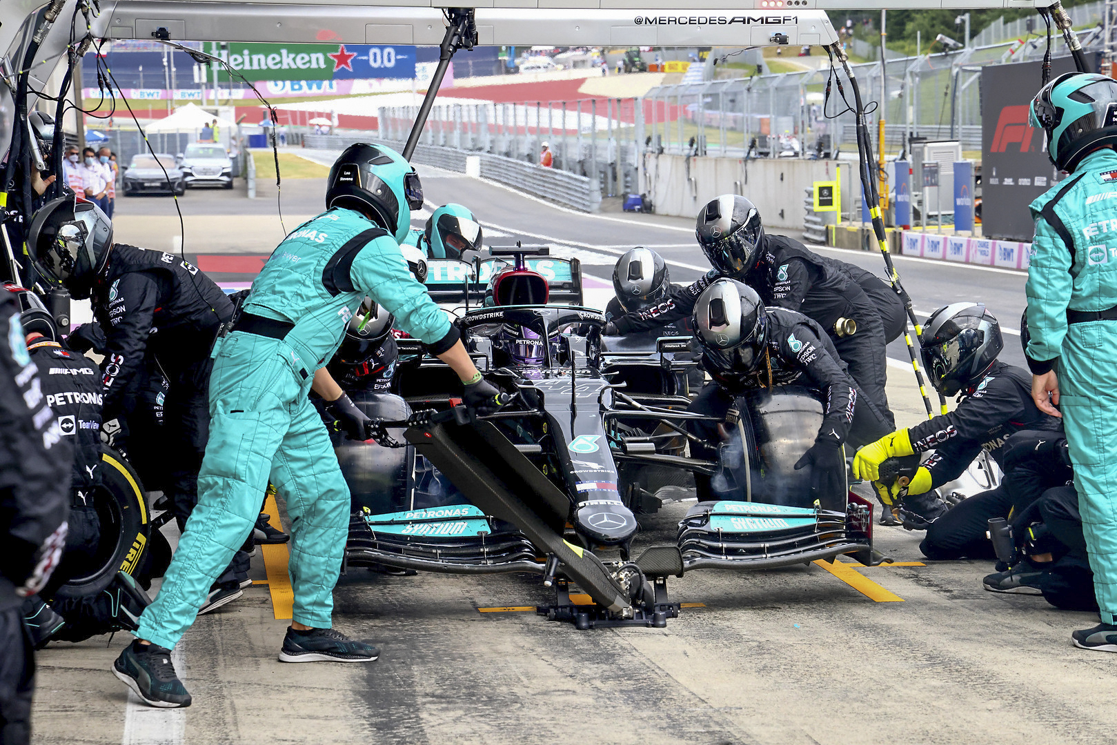 At the start of the race, Lewis and Valtteri had moved up to P3 and P4 respectively after a safety car restart on lap 4 saw PER drop 10 places when jostling with NOR for P2.