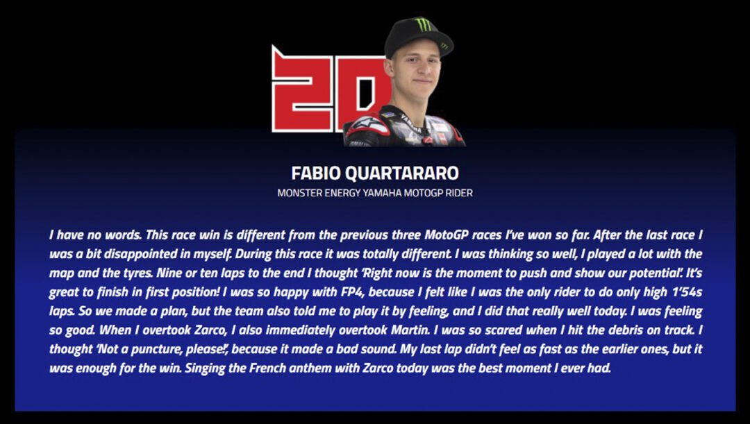 With five laps to go, he skilfully overtook Johann Zarco and needed only a couple more corners to take the lead from Jorge Martin. Though he was briefly overtaken due to slipstream, the Frenchman relentlessly attacked again, making the most of his Yamaha’s corner speed. This time he made it stick and checked out. He put the hammer down and faultlessly rode to his first win of the season, taking it with a 1.457s lead.
