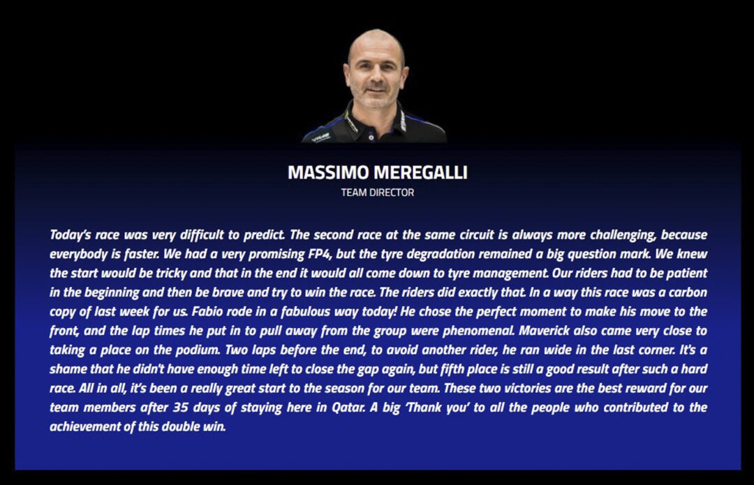Today’s results put Quartararo and Viñales in second and third place in the championship standings, both with a 36 points total. Yamaha and the Monster Energy Yamaha MotoGP team remain in first place with a 50 and 72 points total respectively after Round 2.