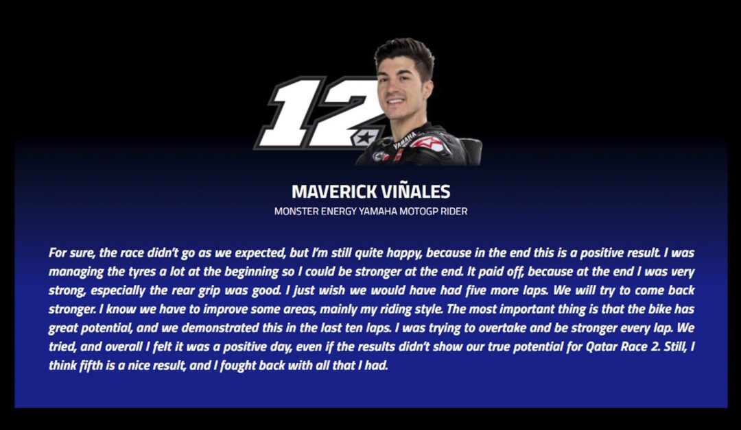 Viñales commenced the race from third place on the grid and settled into ninth at the end of the first lap. Similar to last week, he spent the majority of the race stalking his teammate, saving tyres at the start and going in attack-mode in the decisive stage.