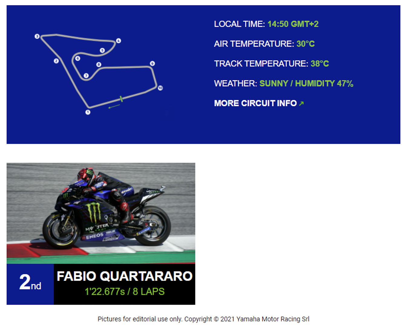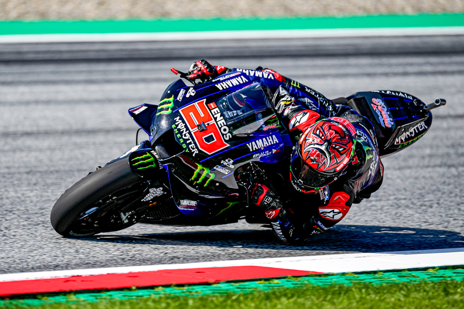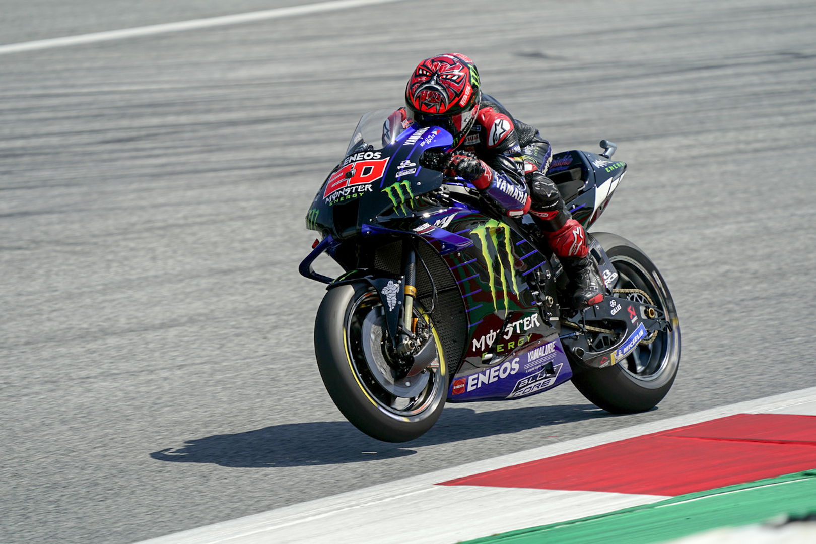 Quartararo allowed the other Q2 riders to go out ahead of him so he could deliver a pole-position-worthy performance with clear track ahead of him. He used his 1‘24.785s benchmark lap to get into the flow and then put the hammer down, clocking a superb 1‘22.677s. It was at the time a new All Time Lap Record in Spielberg, with a 0.360s advantage over the rest of the field. His next 1‘22.794s lap would also have earned him provisional pole and set the All Time Lap Record, but it didn’t improve his best time. Eager to have another go, he quickly returned to the pits.