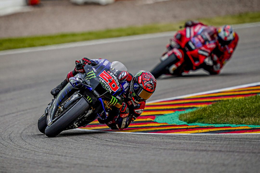 Quartararo had a good start from second but dropped back to fifth as the rider pack dived into the first corner. He then lost another position in the first lap and settled into sixth. Originally the plan was to conserve the tyres in the opening stages to preserve tyre life for the end of the 30-lap Sachsenring showdown. However, nine laps into the race, rain started to fall again, causing many riders to throw caution to the wind and make the most of the slicks while the track was still dry.