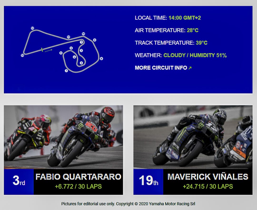 Today‘s results see Quartararo increase his lead in the championship standings to a 22-point advantage and a 131 points total. Viñales remains in sixth, with a 75 points total. Yamaha is still in first place in the Constructor championship with 159 points, and the Monster Energy Yamaha MotoGP team is also in first place in the Team standings with 206 points.