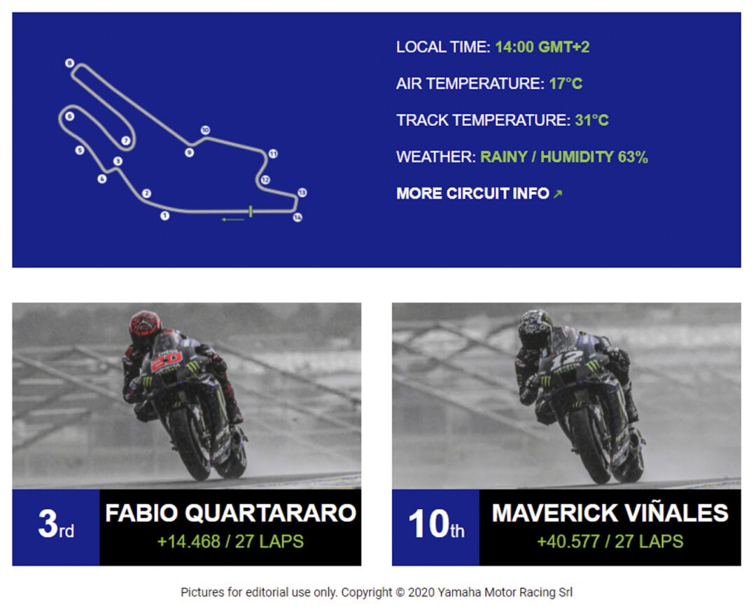 Monster Energy Yamaha MotoGP‘s Fabio Quartararo celebrated today‘s third place as a win, having overcome his wet-conditions Achilles heel and returning to the podium a week after his surgery for Chronic Exertional Compartment Syndrome (CECS or ’arm pump‘). Maverick Viñales showed incredible pace early on, leading the race. However, sudden rain spoiled his plans. He wrapped up the French GP in tenth place.