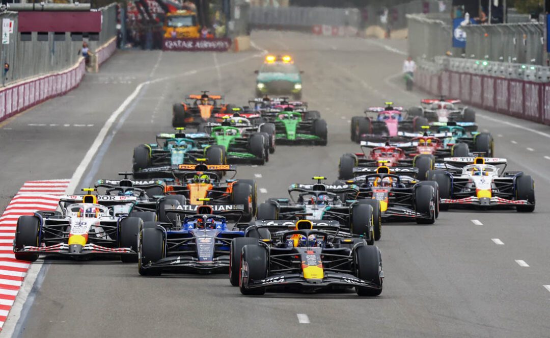BAKU, AZERBAIJAN – SEPTEMBER 21: Max Verstappen of the Netherlands driving the (1) Oracle Red Bull Racing RB21 leads Carlos Sainz of Spain driving the (55) Williams FW47 Mercedes and Liam Lawson of New Zealand driving the (30) Visa Cash App Racing Bulls VCARB 02 at the race start during the F1 Grand Prix of Azerbaijan at Baku City Circuit on September 21, 2025 in Baku, Azerbaijan. (Photo by Mark Thompson/Getty Images)