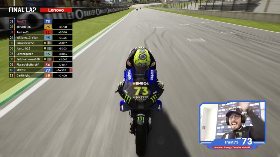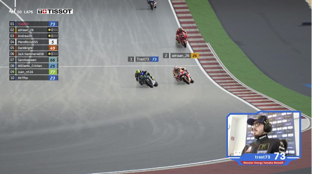 Monster Energy Yamaha MotoGP‘s Lorenzo Daretti (aka 73Trast or Trastevere73) demonstrated once again that he will be a force to be reckoned with during the 2021 MotoGP eSport Global Series. The two-time MotoGP eSport Champion (in 2017 and 2018) started off the first round of the 2021 Global Series on the right note, securing a second and first place.