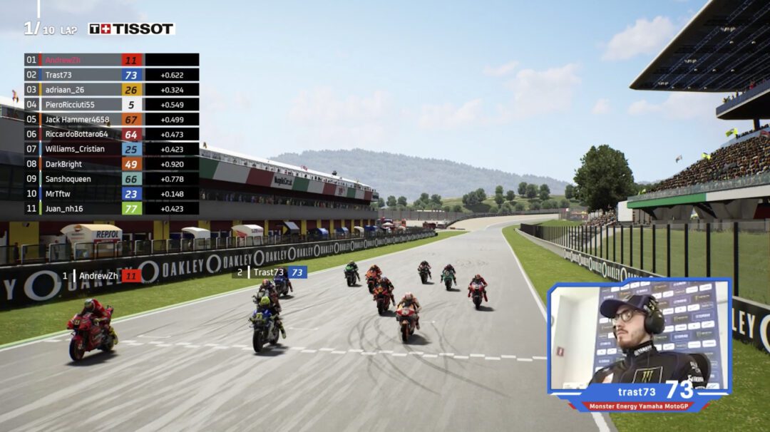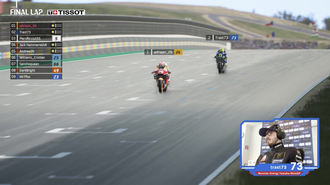 Portimão is known as ’the roller-coaster‘ and 73Trast‘s race there was also filled with ups and downs. His original tactic for Race 1 was to start from third and take the holeshot. He succeeded, but contact with another rider dropped him back to fifth place. However, the Yamaha man is not one to give up easily. He stuck with it, putting in one fast lap after another and soon climbed back up to second position behind Adriaan_26 (Repsol Honda Team). Daretti tried to reclaim the lead again but came just short and had to settle for the runner-up position.