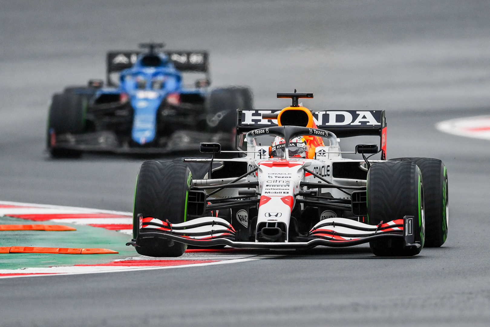 Sergio Pérez of Mexico came in behind his Red Bull Racing Honda team-mate, crossing the line in third on the 58-lap race at the Istanbul Park circuit, where weather conditions meant racing in constant drizzle.