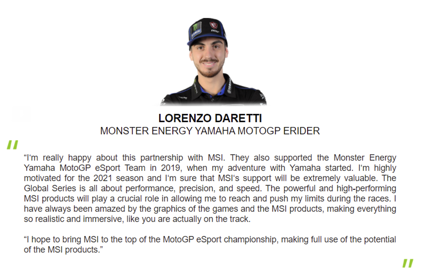 Yamaha Motor Racing Srl are delighted to announce that MSI, a world leading gaming brand, has been added to the Monster Energy Yamaha MotoGP Team‘s growing line-up of official MotoGP eSport partners. MSI will be the official hardware gear provider for the Monster Energy Yamaha MotoGP eSport Team in the 2021 season.