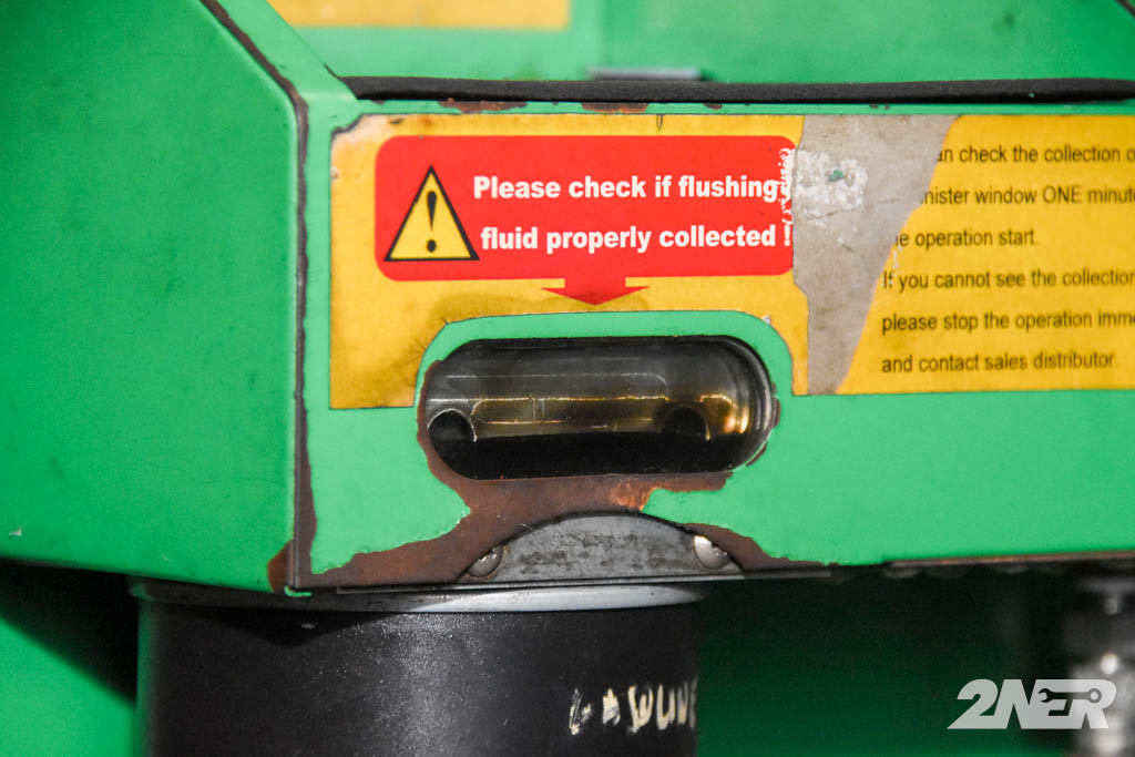 After draining the old engine oil out of the engine first, the green Sludgenizer machine is hooked up to the engine through two specially terminated hoses. Then the cleaning can begin.