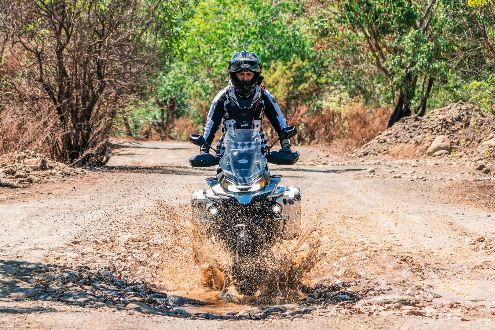 Thanks to the lightweight construction, the CFMOTO 800MT is supreme in riding precision, coupled with ergonomics for your on-road touring comfort. CFMOTO 800MT is equipped with an upside-down telescopic adjustable KYB front suspension, which provides 20-clicks adjustment of preload, compression and rebound damping, making it capable of handling various terrain, giving confidence and riding stability. The front suspension spring travel is 160mm, and the rear suspension spring travel is 150mm. Matched with 190mm of minimum ground clearance, the sophisticated chassis ensures that the motorcycle can confidently travel through mountain roads and bumpy surfaces.