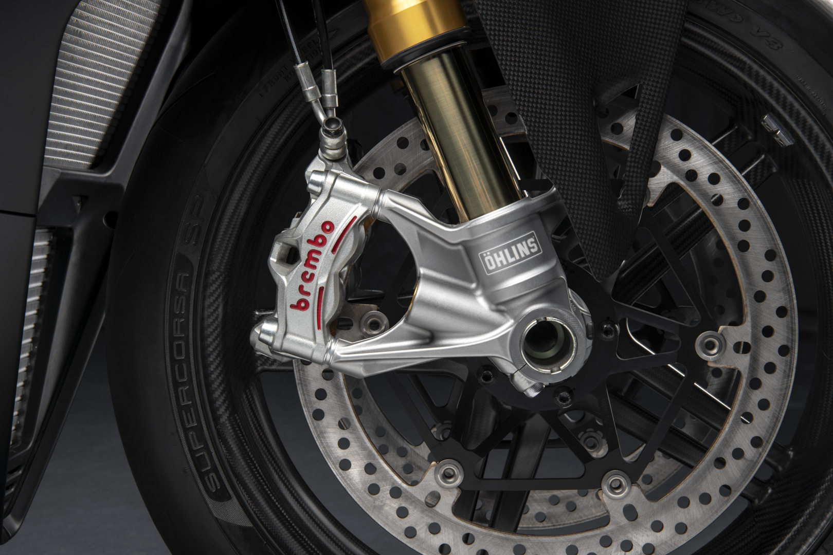 The Panigale V4 SP2 is also equipped with exclusive Brembo Stylema R® front brake calipers, which guarantee high braking power combined with exceptional consistency of performance even during a lengthy timed session without changes to the travel of the brake lever. The calipers are operated by a Brembo MCS (Multiple Click System) radial pump that allows you to adjust the wheelbase quickly and easily on three configurations to customize the braking feeling.