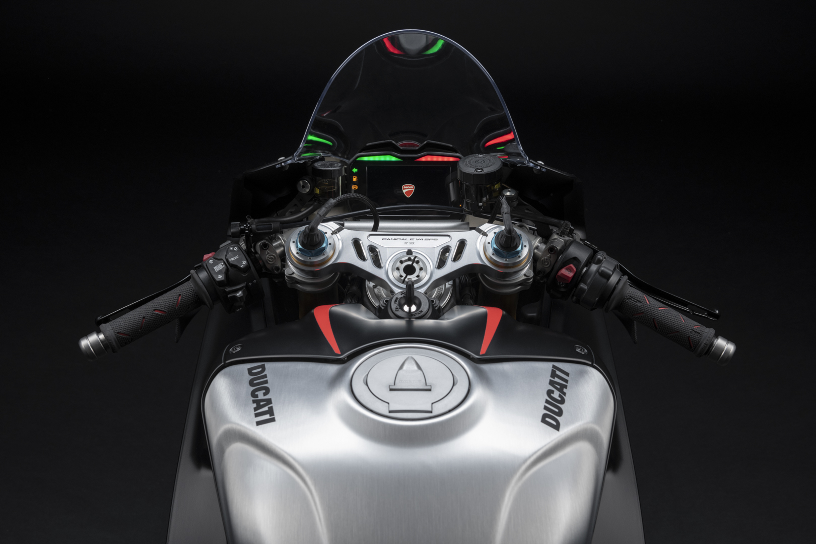 This clutch guarantees a more effective anti-hopping function in extreme use of the bike on the track and greater fluidity in all phases of “off throttle” compared to the oil bath clutch of the Panigale V4 S. The STM-EVO SBK clutch also offers the possibility to customize the “mechanical” engine brake level by choosing a different secondary spring from those available in the Ducati Performance accessories catalogue.
