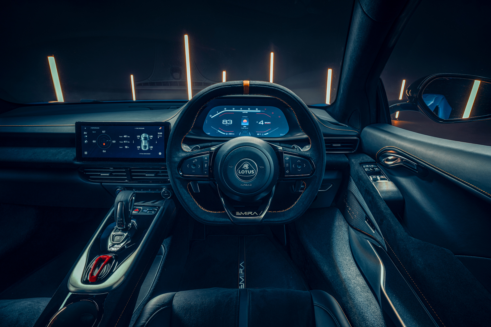 Also unique to the Emira is the flat-bottomed sports steering wheel with metallic spoke detail and integrated controls. The interior features ambient and wraparound lighting as well as map lights.