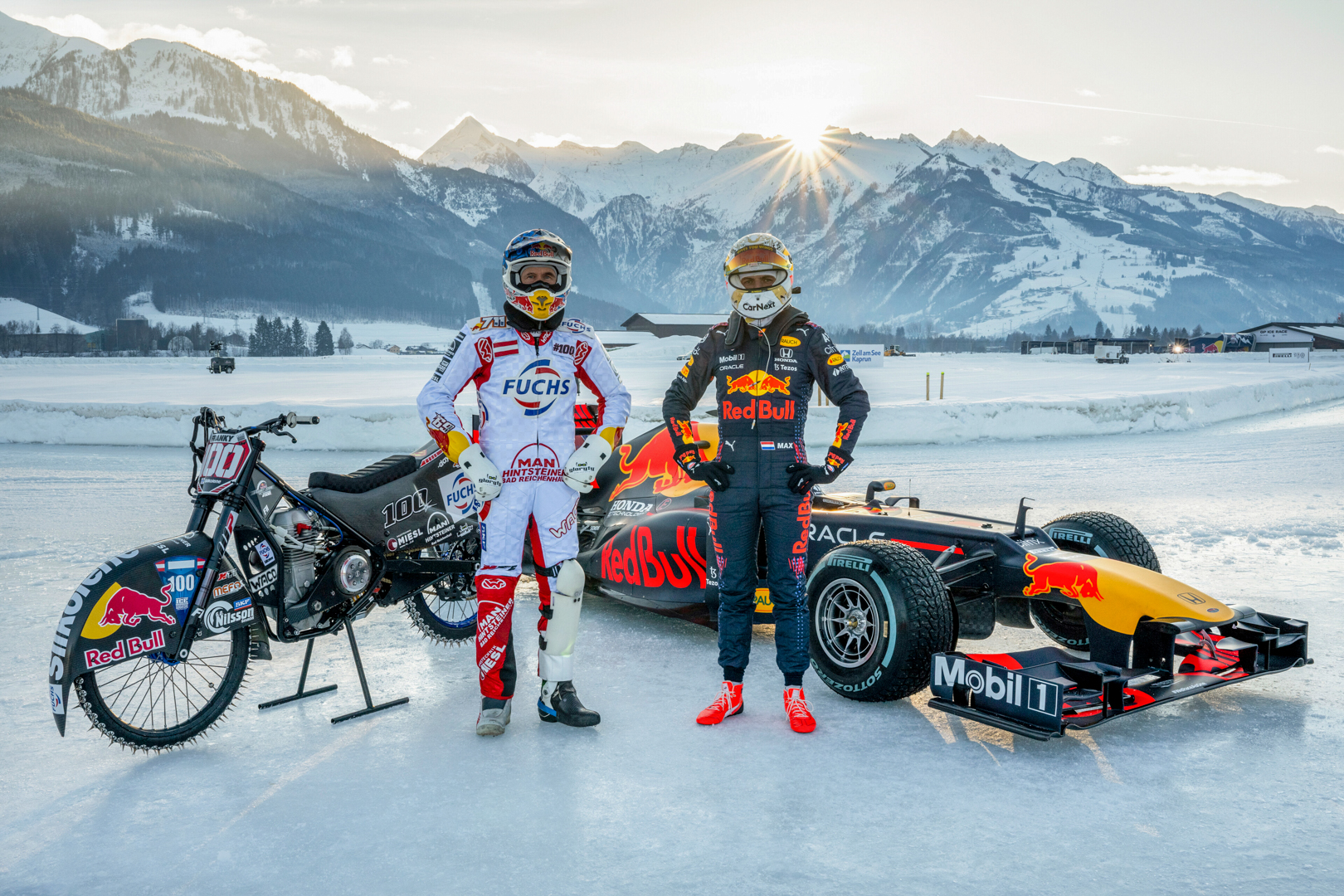 Under Austria’s winter sunshine, the Dutch hero savoured being back in a race car for his first laps since winning the F1 Drivers’ Championship at Abu Dhabi in December, while Zorn popped wheelies and slung his motorcycle to extreme angles around the curves.