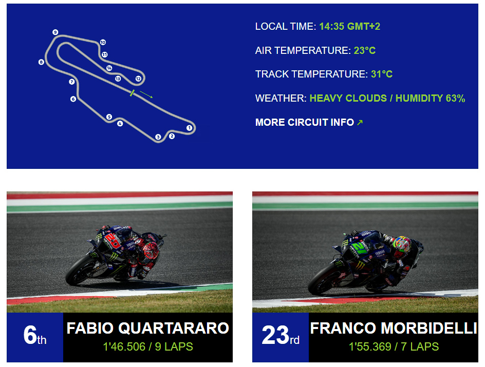 Monster Energy Yamaha MotoGP‘s Fabio Quartararo and Franco Morbidelli had to navigate tricky conditions during today’s Gran Premio d’Italia Oakley MotoGP qualifying sessions, as rain during FP4 had made the track slippery. They secured 6th and 23rd place on the grid respectively.