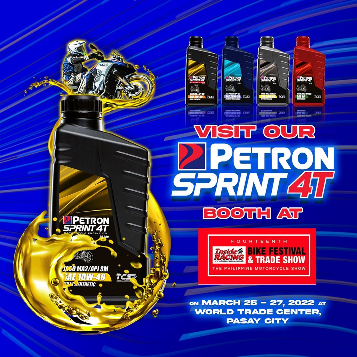 The Petron booth will showcase its Petron Sprint 4T motorcycle engine oils, which have been specially formulated for Philippine road conditions. In addition to the highlight of Petron’s motorcycle oil, latest BMW motorcycle bikes will be displayed on-site and exciting games have been prepared for this big event.