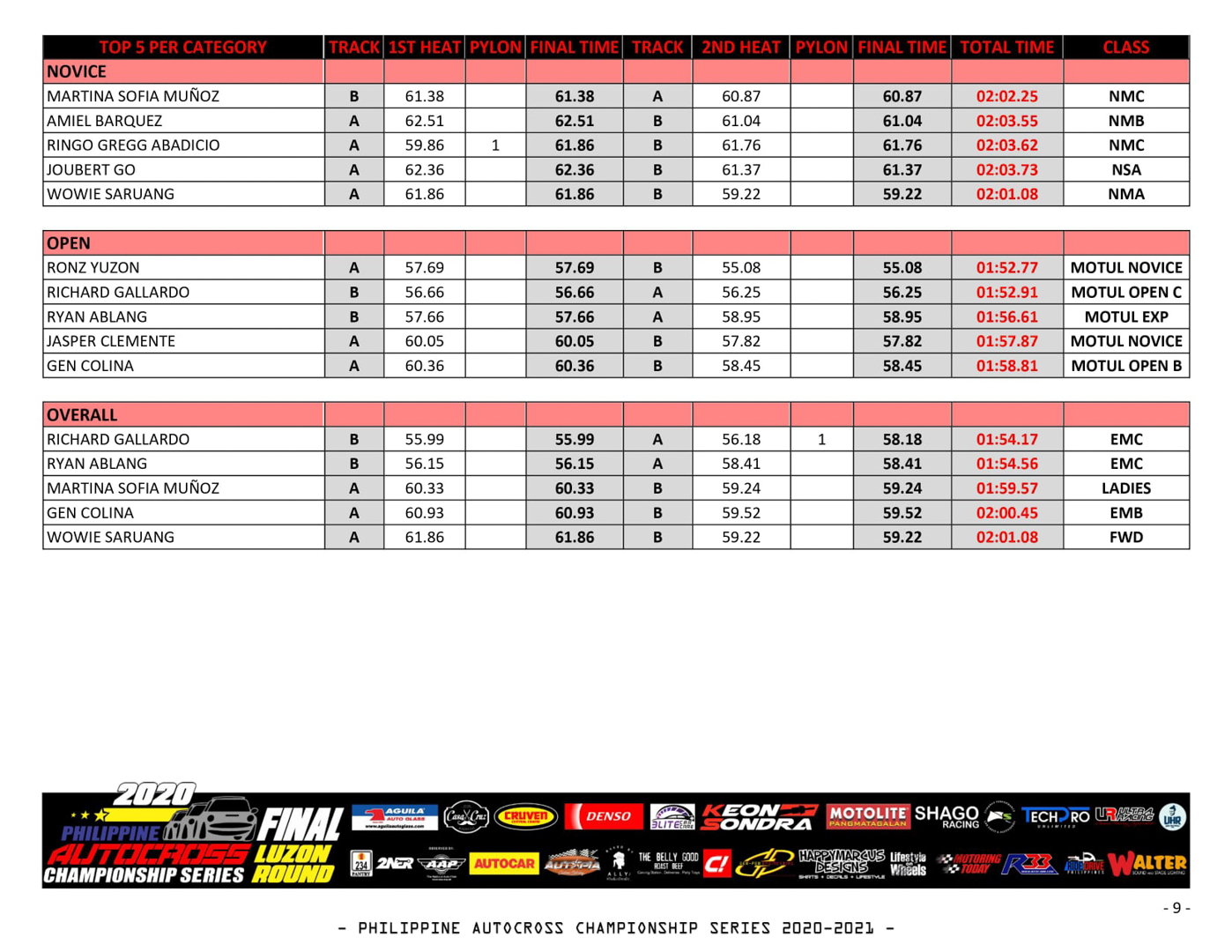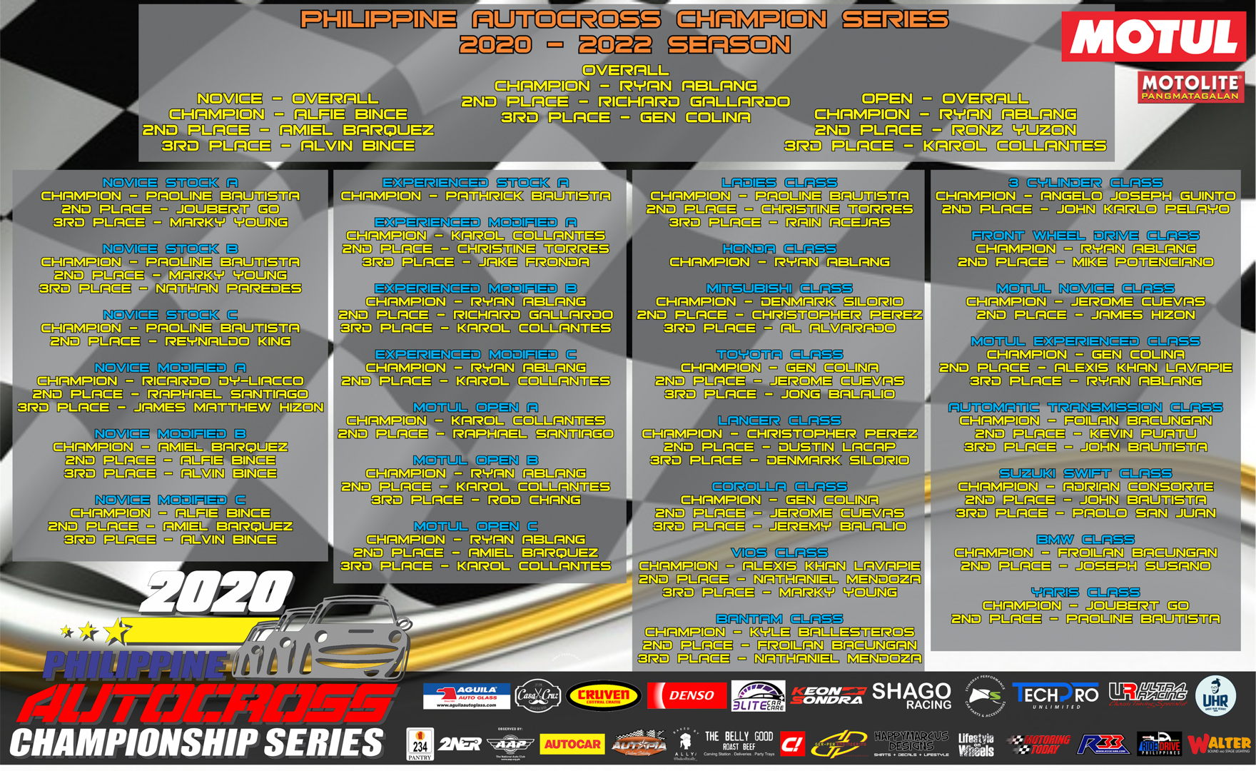 Aguila Glass,Casa yCruz, Cruven Central, Denso Spark Pkugs, Elite Car Care, Keon Sondra, Motolite, Stingray, Tech Pro and Ultra Racing.