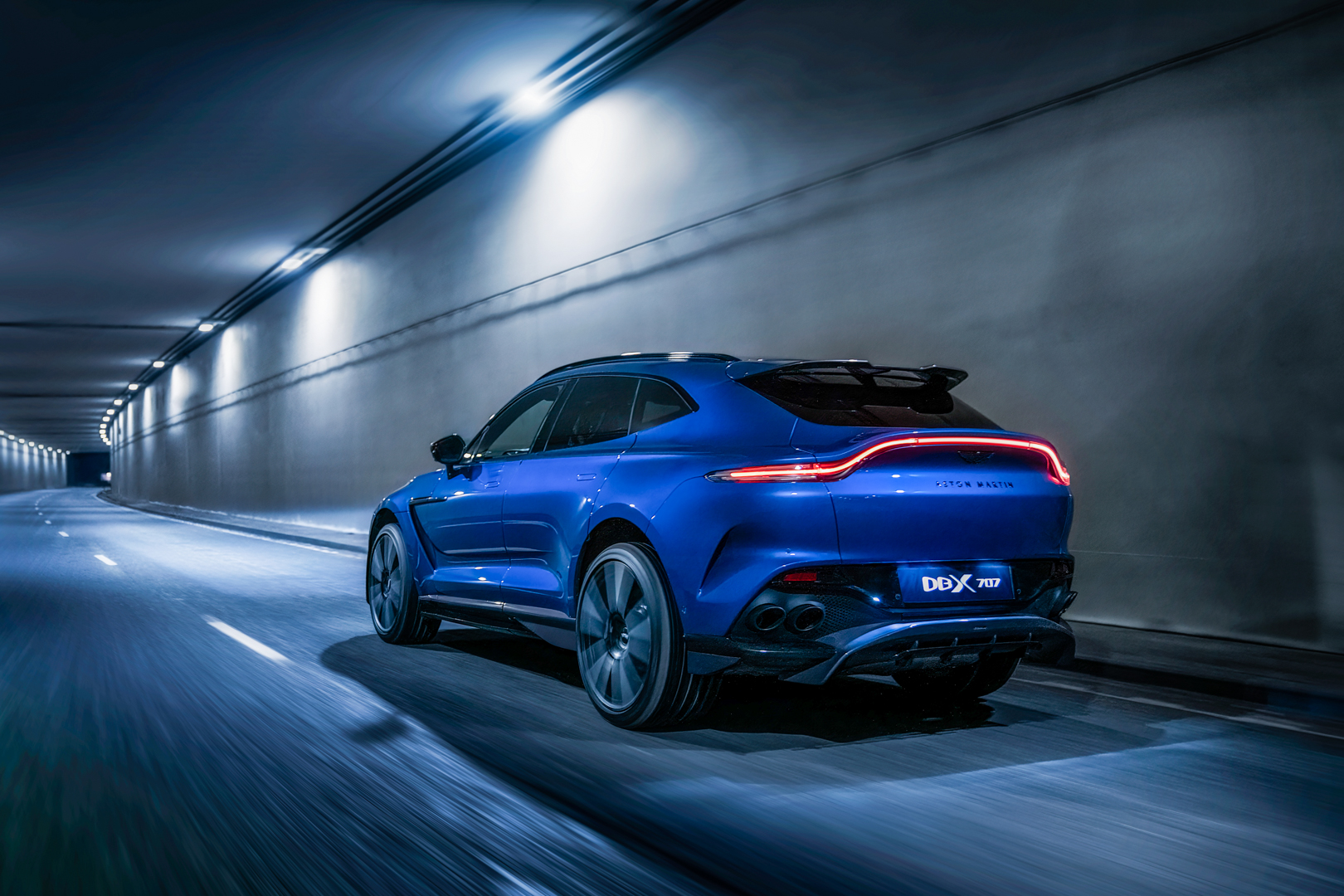 Rear-end treatment is just as dramatic. Enhancing both aesthetic form and aerodynamic function a new lip spoiler has been added to the roof wing to reduce lift and increase high speed stability, with a significantly enlarged twin rear diffuser rising to meet the new large diameter quad exhaust system. Finished in satin black to compliment the gloss black treatment of the diffuser this new exhaust has been tuned to deliver a unique sound signature. Completing the rear-end changes a new rear bumper complete with integrated quarter panel vents accentuate the DBX707’s muscular physique.