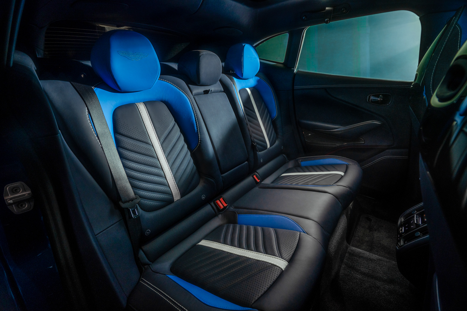 The sporting theme continues inside with Sport seats fitted as standard (Comfort seats are available as a no-cost option). All seat options come with 16-way electric adjustment plus heating in front and rear as standard. There are three choices of interior environments – standard-fit Accelerate, which features a mix of leather and Alcantara®, as well as the optional Inspire – Comfort and Inspire Sport, which features full Semi-Aniline leather complete with embroidered Aston Martin wings on the headrest, a contrast stripe down the centre of the seat and perforation pattern in the seat back and base cushion.
