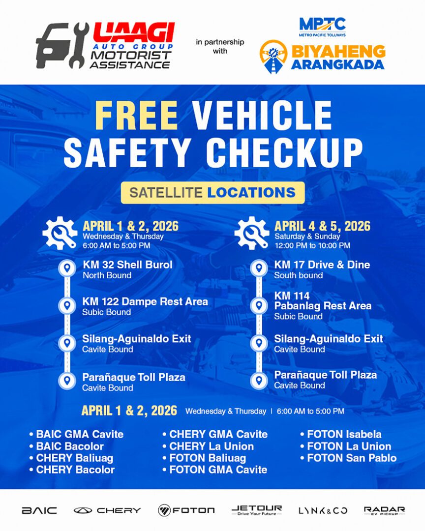 In partnership with Metro Pacific Tollways Corporation’s (MPTC) Biyaheng Arangkada program, UAAGI brings expert vehicle care closer to motorists along major routes. Owners of BAIC, CHERY, FOTON, JETOUR, LYNK&CO, and RADAR vehicles can visit designated satellite service locations where trained UAAGI technicians will conduct complimentary safety inspections to ensure cars are road‑ready.